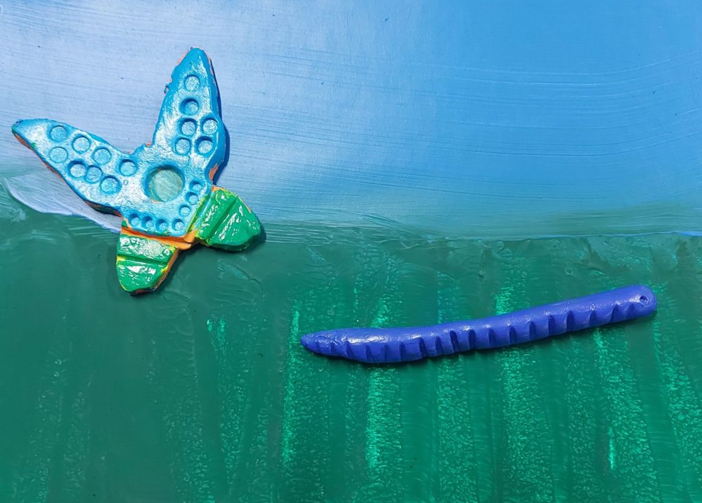 Prep recently completed delightful ceramic butterflies and worms on a mixed media background, showcasing their imaginative spirit.