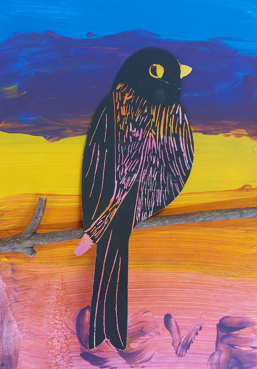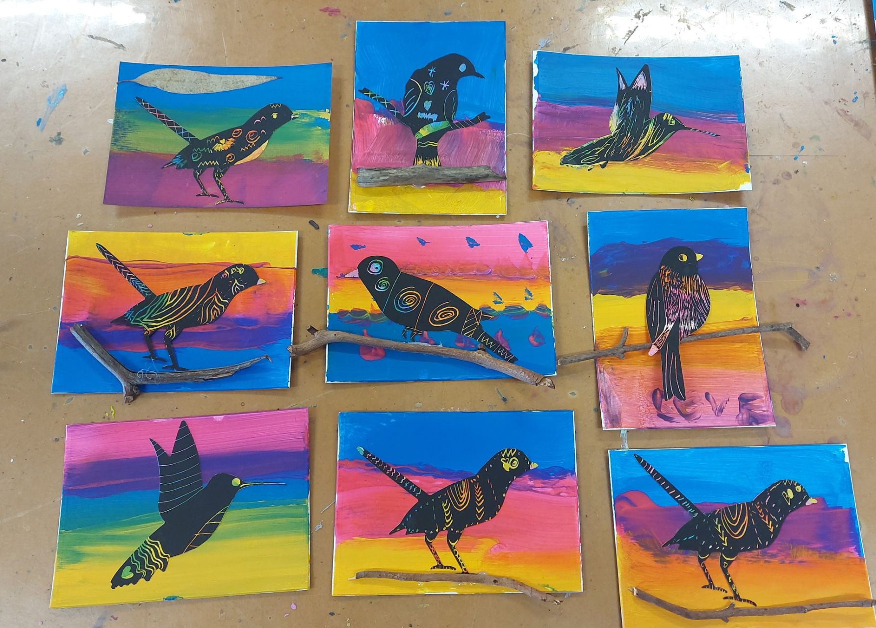 Year 1 students embraced their enthusiasm by creating scratch art birds, incorporating shapes, lines, and patterns on painted canvas boards using foam brushes.