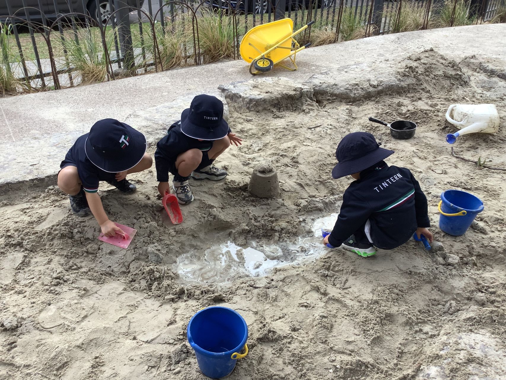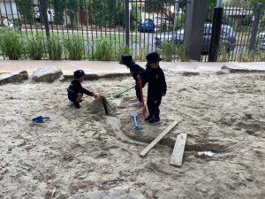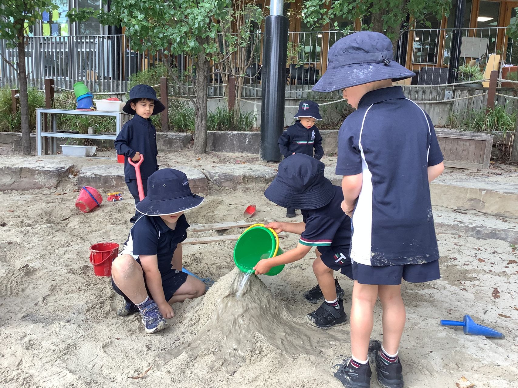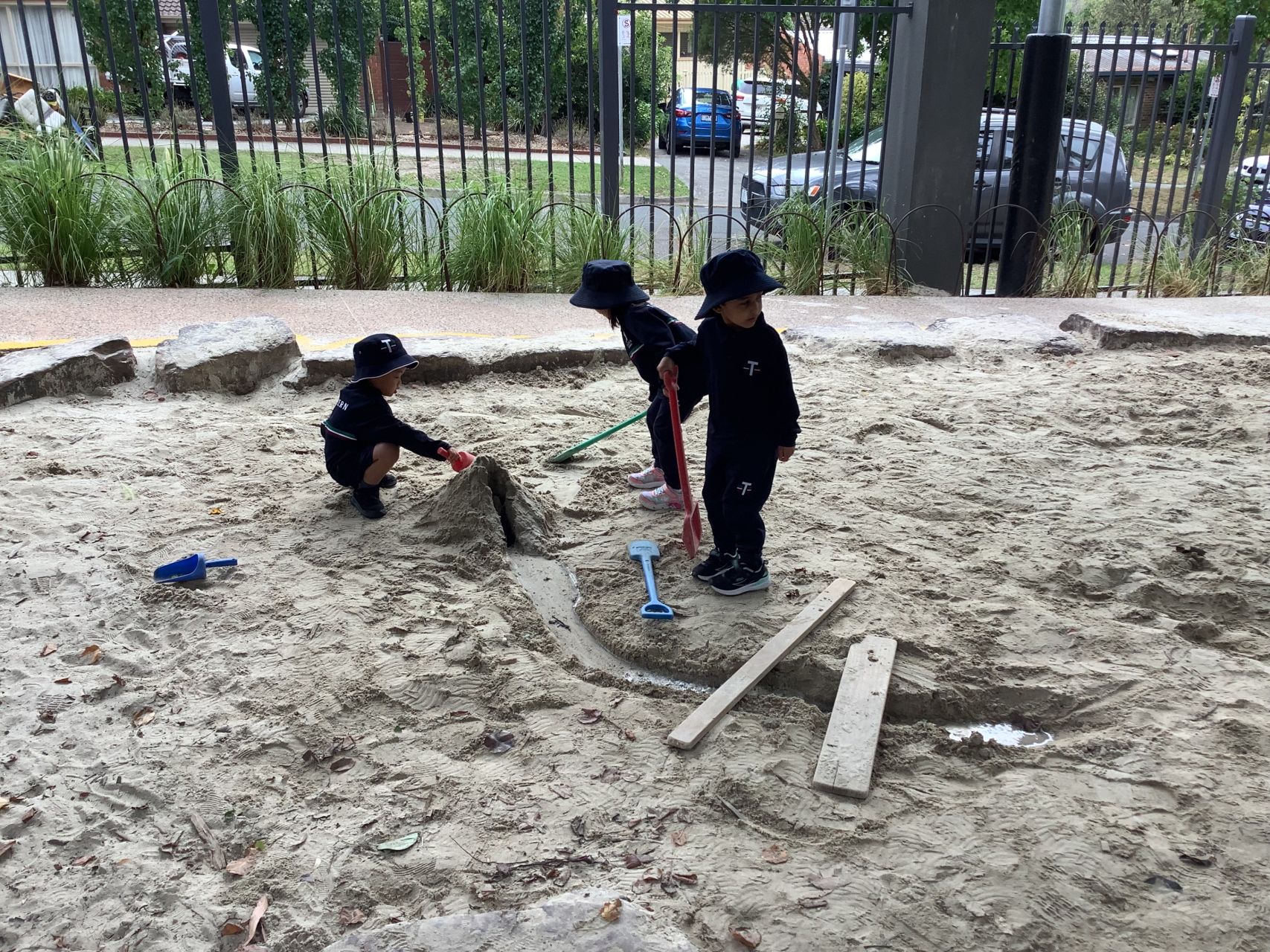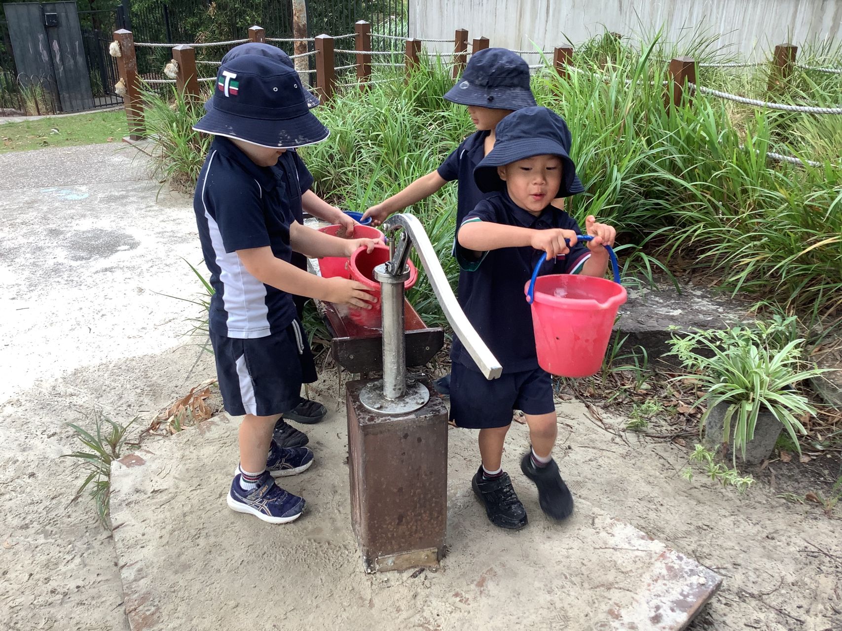 The water wheel in our outdoor space is one of the most popular areas during outdoor play. Children will often drift in and out of the area collecting water for whatever play they are involved in. Some students spend great lengths of time there watching, pumping, accessing the water and carrying it to and fro. There are a lot of different ways that children can use the water wheel, with opportunities to use critical thinking to investigate and explore movement, trial and error, experiment with the flow of the water and the spinning of the wheel. It is a great way to learn and discover cause and effect. Whether the children are exploring the area individually or as a collective group, you can often observe their thinking. Some will excitedly call out to their peers, ‘look at how fast the water is going!’ while others will race to the other end of the water wheel demonstrating their curiosity as to where the water is flowing to. It takes dedication and several pumps to bring the water up from the ground. They marvel as the water comes out of the pump, how it spins the wheel, how they could stop the water with the dam and how it cascaded down the ramps.