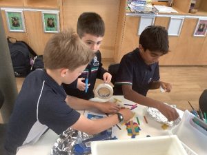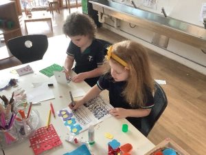 As the year progresses, we increase the complexity of pasting activities to keep children engaged and to further develop their skills. We may introduce smaller or more intricate materials, three-dimensional elements, or change the surface they’re working on—such as moving from flat paper to cardboard, cork, or natural materials. Layered pasting and box construction are also included to extend their thinking and creativity.