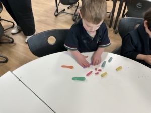 Play dough supports language and communication. As children chat about what they’re creating, they build vocabulary and express ideas. Educators gently guide the conversation with questions like ‘What do you see?’, ‘What makes you say that?’, or ‘What will you do next?’ These interactions help children learn to think, describe and imagine – skills that prepare them for both school and life.