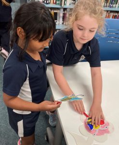 In the STEAM centre, Mrs Campbell showed us how to make pollinators. Insects and birds pollinate plants by spreading the pollen from their bodies between flowers. This helps plants produce seeds. Our colourful honeybees gathered pollen from a variety of flowers to mimic the pollination process. Jelly crystals make great pollen and the senior students in the library sure wished they could join in our fun activity. Did you know that if we don’t have pollinators, we don’t have seeds. If we don’t have seeds, we don’t have plants, ….you get the gist. Thank goodness for pollinators!