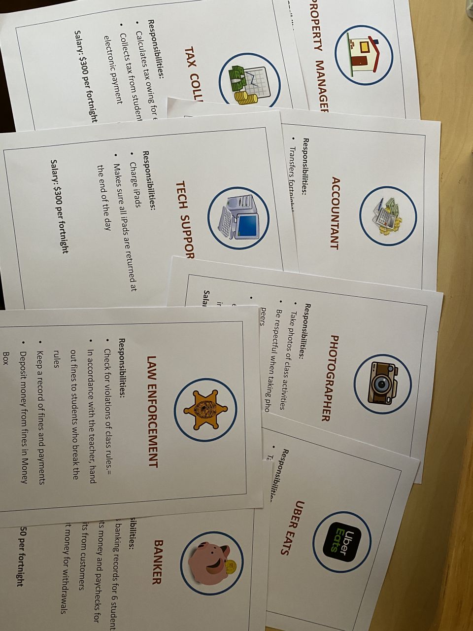 In our class, we have also started a classroom economy called, ‘Benson Bucks’. Students have to write a cover letter and CV to apply for various jobs in the classroom such as property manager, accountant, banker, tax collector, tech support and law enforcement. They are paid a wage and need to save their money to pay for rent of their seats, tax and supplies around the classroom. Each fortnight they get paid for their job and have to pay rent for their seats. Students also have the opportunity to deposit and withdraw any of their Benson Bucks. The students have been diligently been saving their money so that they can “purchase” their own chair instead of renting. It is a great opportunity for students to develop real-life skills.