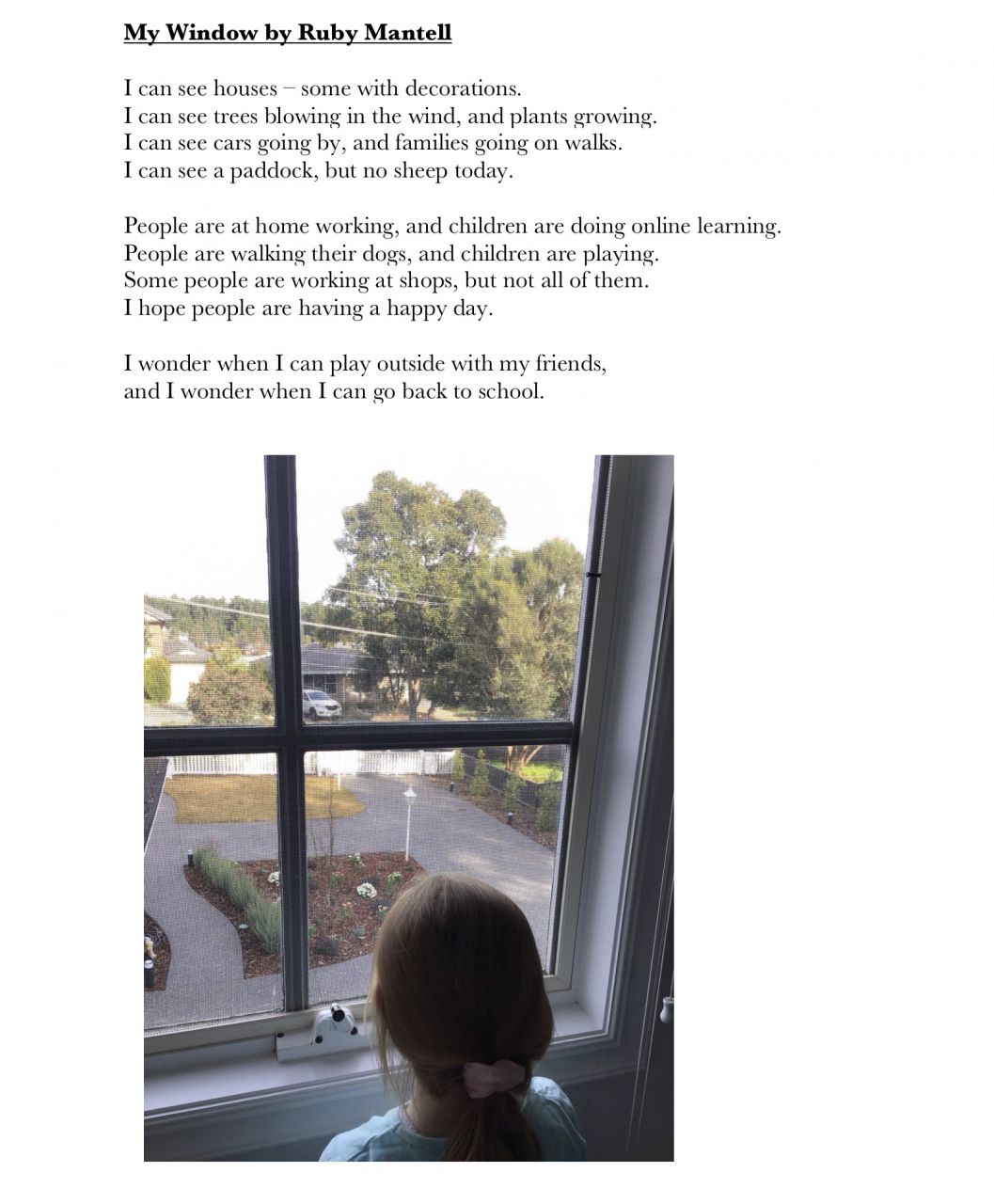 Whilst Girls’ Junior School students have been learning from home, girls have been looking out their windows and sharing what they can see with their classmates, following the viewing of a special book which was written for children around the world in the times of COVID-19. Windows, by Patrick Guest and Jonathan Bentley https://youtu.be/_yQv4_rhhU4 is a beautiful representation of our current world. Students have taken the time to slow down and observe their environment, showing the many beautiful things we are grateful for at the moment.