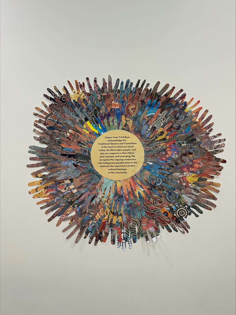 Following, they collaborated to develop their own Boys Middle School acknowledgement statement. In the artwork, their acknowledgement forms the centre point of the circle. Surrounding, are the traced outlines of every single boy’s hand in the Middle School in variations of indigenous artworks that resonated for them. As such, each boy is represented in their own unique way.