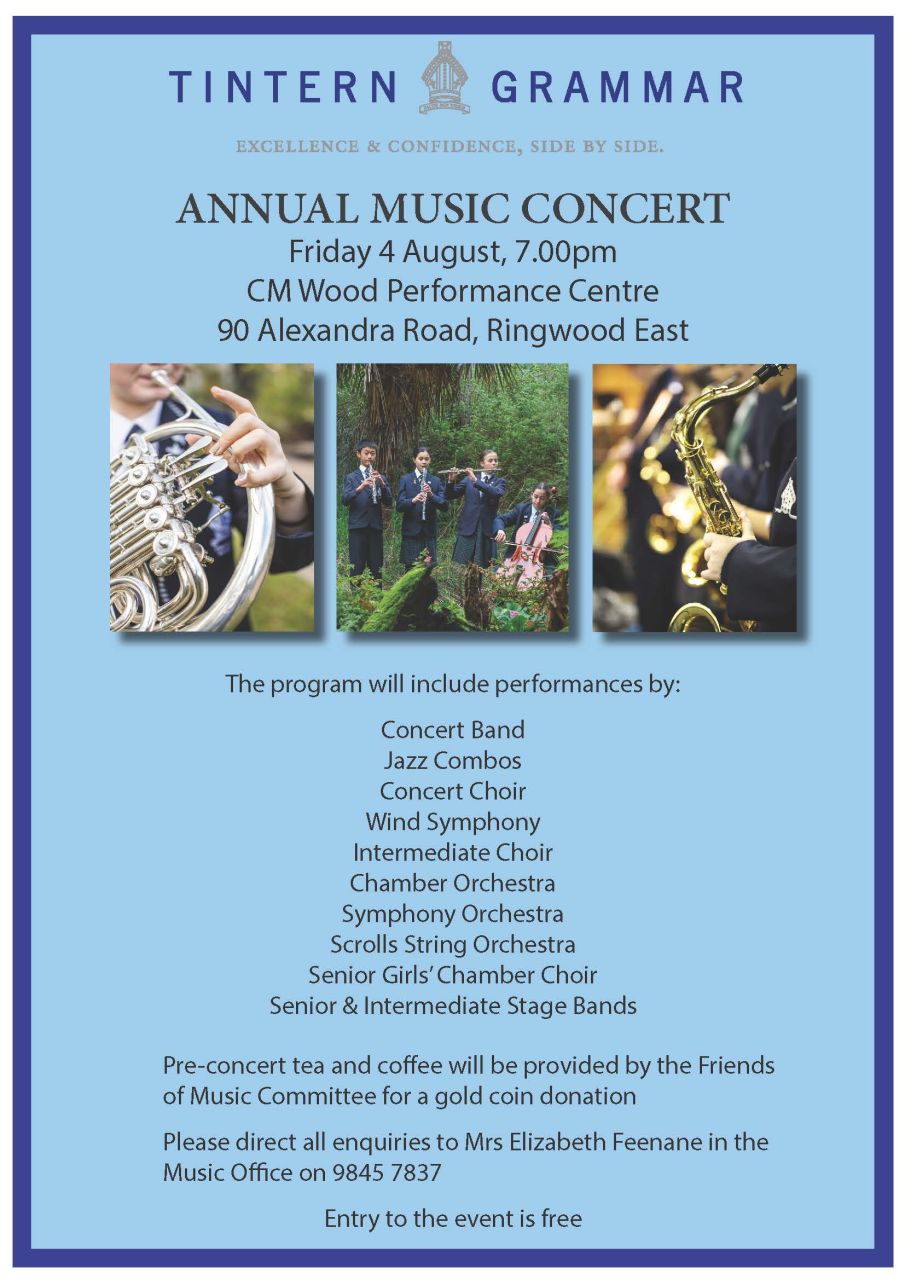 A massive thanks to all the music staff at Tintern and the parents from Friends of Music who have put in a lot of work to make this weekend become a reality, we are so grateful for their never-ending support. We hope to see everyone at the Annual Music Concert on Friday 4 August, 7.00pm in the CM Wood Centre to witness the amazing performances that our musicians have worked so hard to put together!