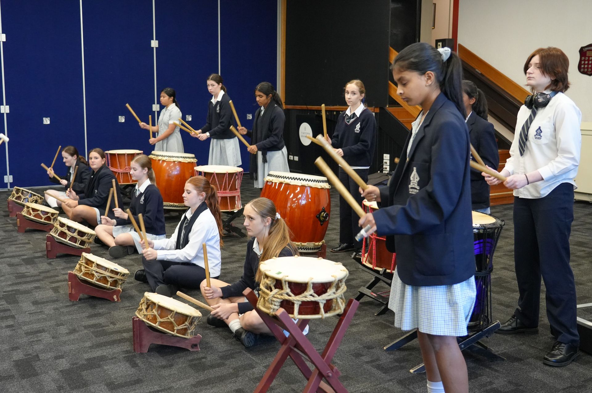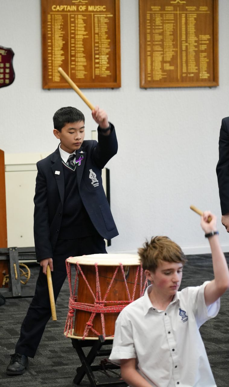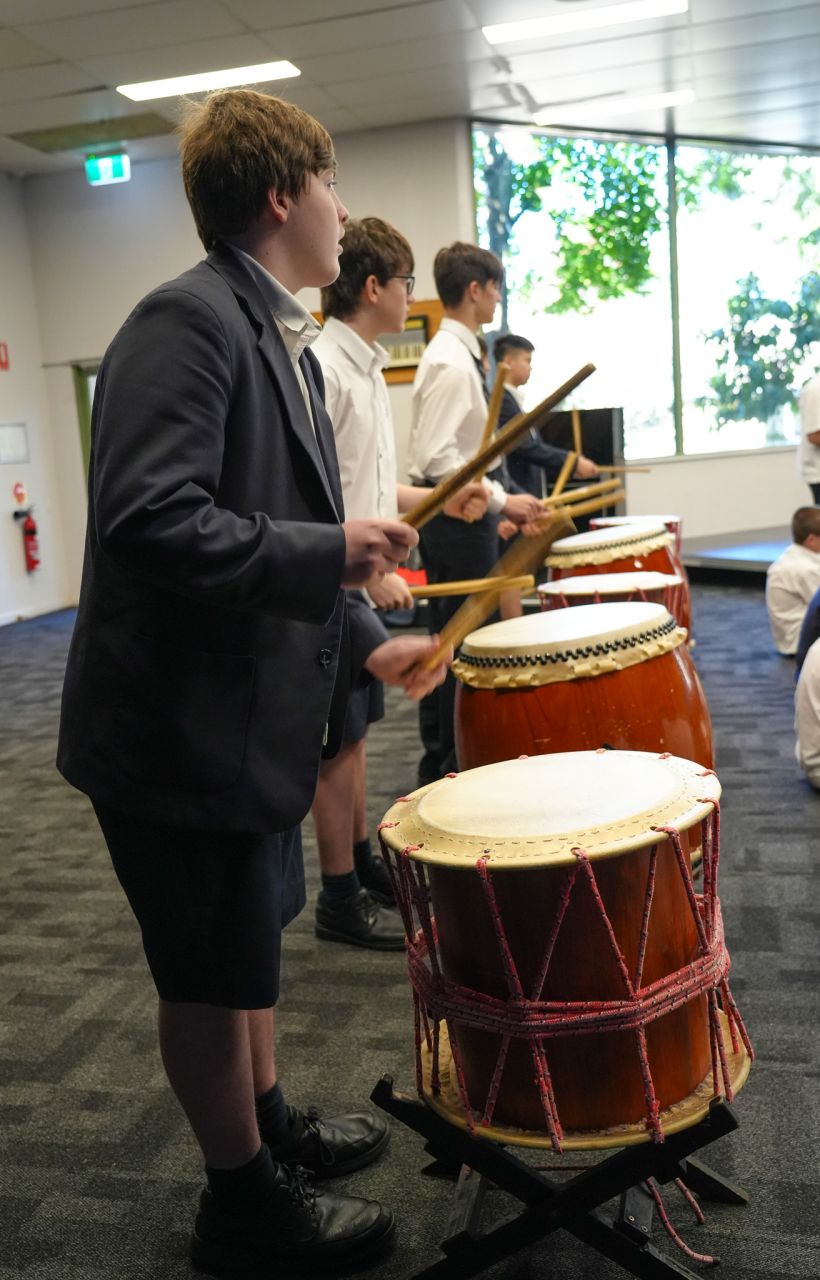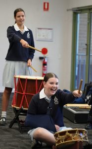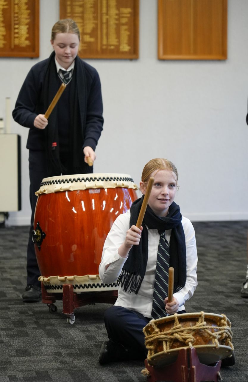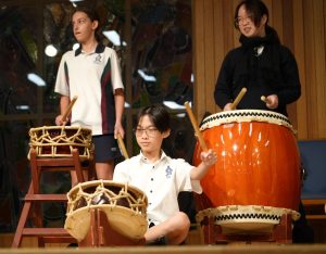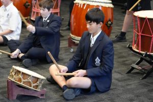 On Monday 22 April in the CM Wood Centre, Years 7 and 8 students enjoyed a Japanese Taiko drum performance by Anne and Toshi. two incredible musicians who introduced us to their instruments in an engaging and interactive way. Volunteers were asked to come up on stage and play a certain beat, and they helped us to learn the names of the instruments in Japanese. They played two different types of instruments: the shakuhachi and the taiko drum. The shakuhachi is a flute made with bamboo. The musician plays the different pitches using their breath, head, and throat, as well as the holes in the bamboo. Unlike other flutes, the shakuhachi is played vertically, instead of horizontally. The taiko drum is played by hitting the surface of the drum with drumsticks, known as bachi. There are different sizes of taiko drums and bachi, known as either oki (large), or chisai (small). After this wonderful performance the Year 8 classes currently studying music enjoyed a workshop with Toshi where we learnt how to play the taiko drum, and how to play different rhythms and timbres. Toshi then taught us a group piece with multiple parts. Each part had a different rhythm that suited the tone and size of each drum and drumstick. Many agreed that this was one of the best world music concerts we have had so far! Everyone who participated had so much fun!