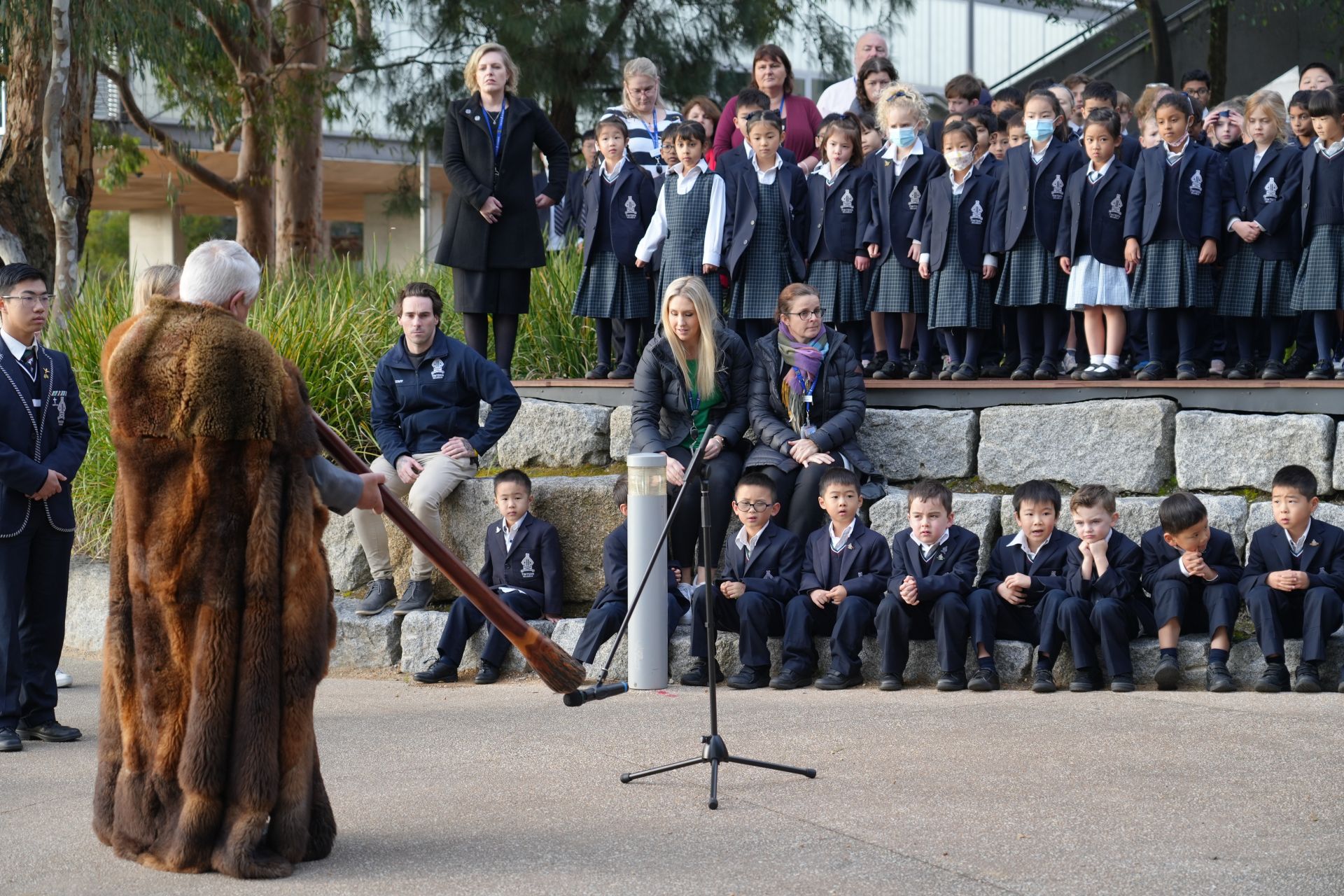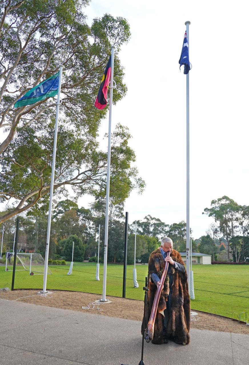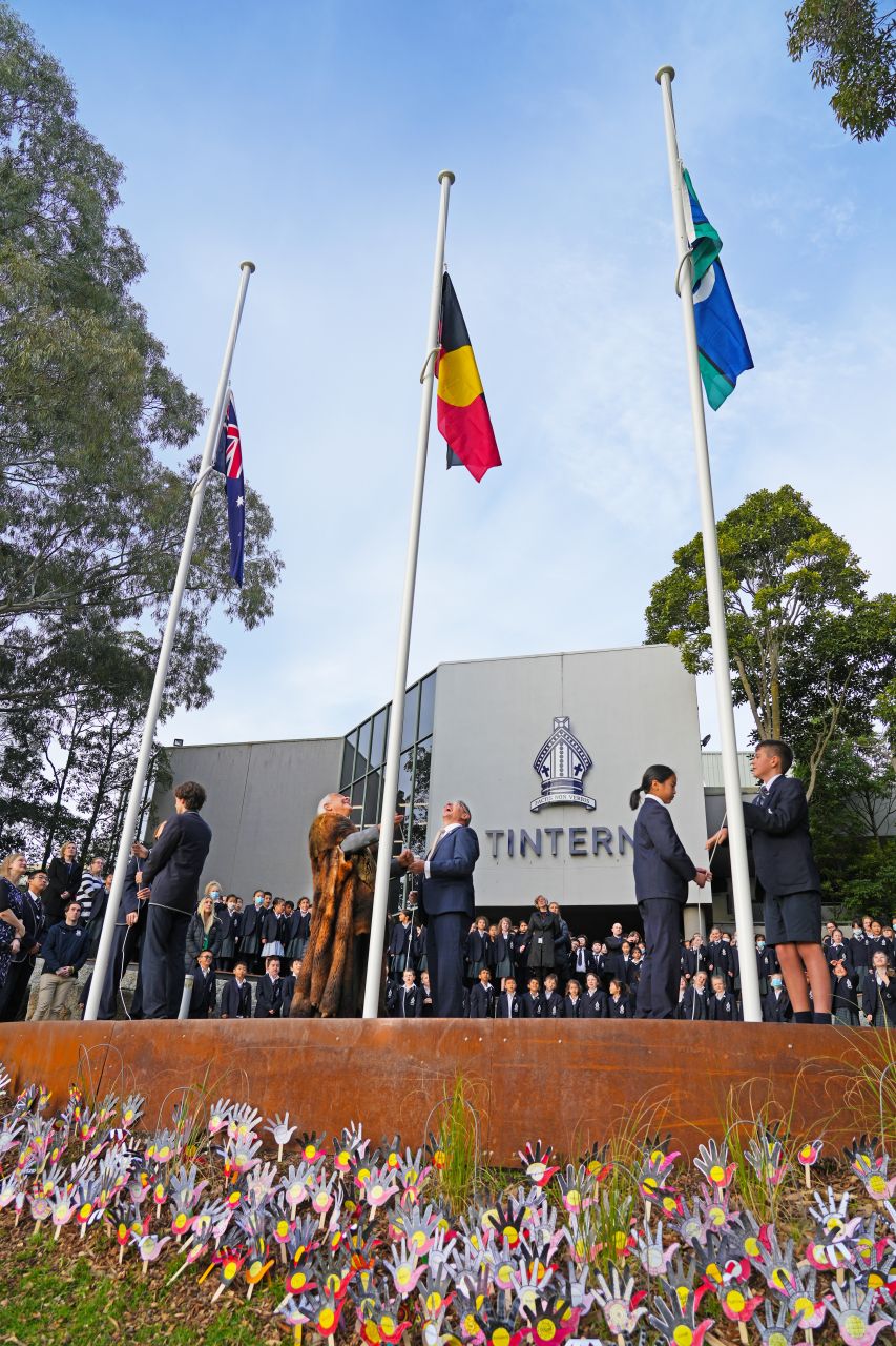 On Monday, 5 June, Tintern Grammar was proud to take one further step in the Reconciliation Journey with our Indigenous brothers and sisters. We have had new flag poles erected at our Community Hub and Murrundindi (Head man of the Wurundjeri clan) joined us to raise our flags. For the first time, all three Australian flags, the Australian, the Australian Aboriginal and the Torres Strait Islander flags were raised simultaneously by Murrundindi, Mr Brad Fry, our School Captains and our Junior School Captains.