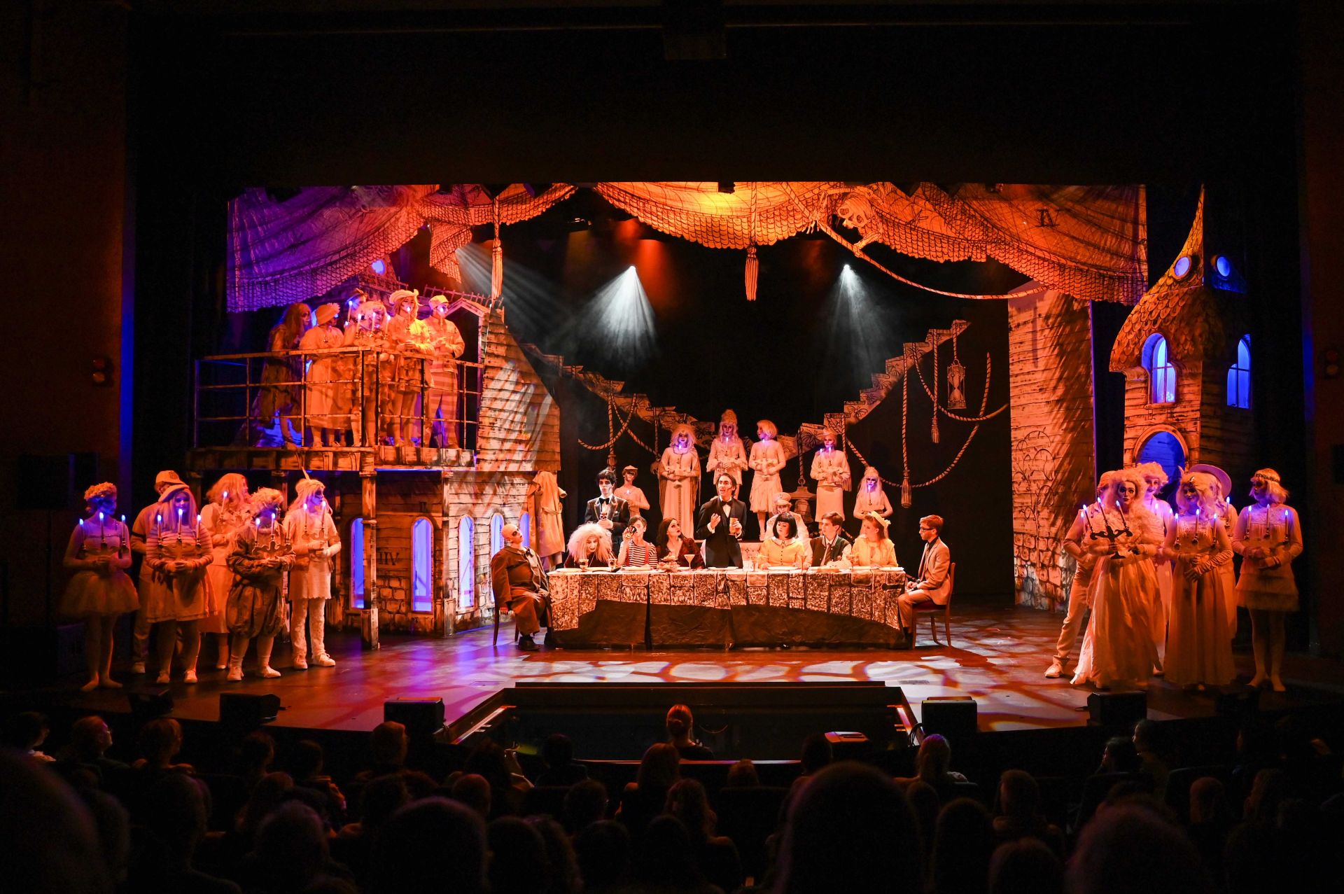 Emily performs her show stopping number Pulled as she prepares for the dinner where her strange family will need to entertain the ‘normal’ family of her fiancé Lucas Bieneke played by Brayden Mallet Pugsley, played by Coby Ashman, then performs What If, where he struggles with the reality that his chief tormentor (his sister Wednesday) may no longer have time to torture him anymore, and a plan is hatched. Then Lucas and his parents, Alice (played by Ashley Honan) and Mal (played by Xavier Kemm) arrive and both families sit down and have a hopefully ‘normal’ dinner. ‘The game’ is then played where Pugsley attempts to poison his sister’s drink with a truth-potion to scare off her new boyfriend, but Lucas’s mother Alice instead drinks the poison leading to her revealing her deep truth of her failed marriage in her flawless song Waiting. The chaos of crazy Alice leads to the secret engagement being leaked and Act 1 ends in madness.